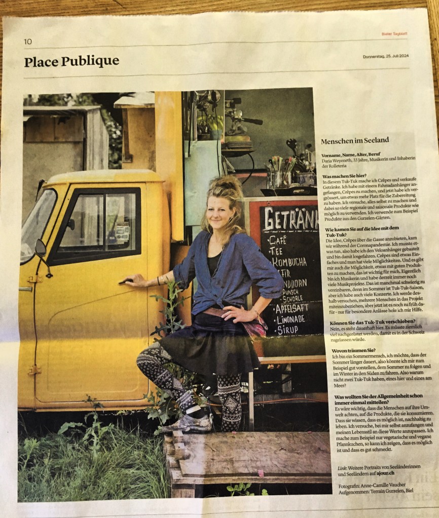 Gestartet hat das ganze mit dem Konstruieren eines Crêpes-Veloanhängers. Inzwischen Servierte die Rolleteria schon an Verschiedensten Standorten in Biel und Umgebung Crêpes & Galettes; soweit der Pedal-Power reicht…